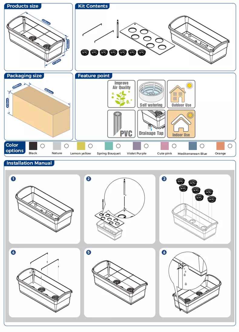 Ez a 30 literes önöntöző gyalu alkalmas zöldségek, zöld növények és virágok termesztésére. Vízszintmérővel van felszerelve a vízszint figyelésére. Ha a vízszint meghaladja a maximális értéket, ki kell engedni a vizet az edényből. Az edény oldalán van egy leeresztő szelep. Nyomja befelé a záráshoz, és húzza kifelé a víz leeresztéséhez. Ez az edény beltéren és kültéren is használható. Ha kültéren használja, feltétlenül nyissa ki a leeresztő szelepet, hogy megakadályozza a víz felgyülemlését az edényben az eső miatt.