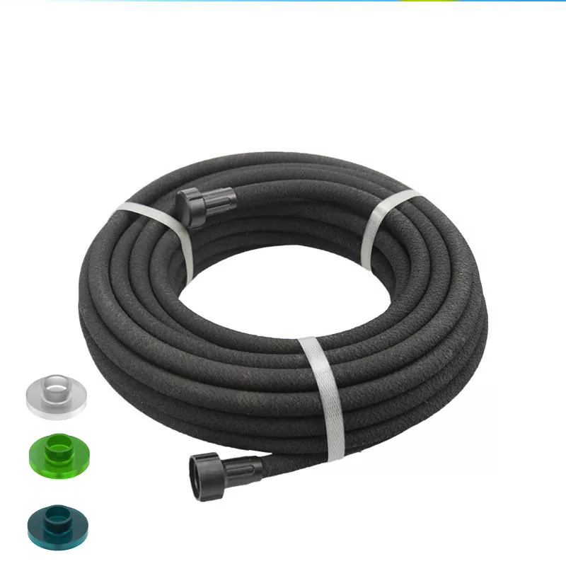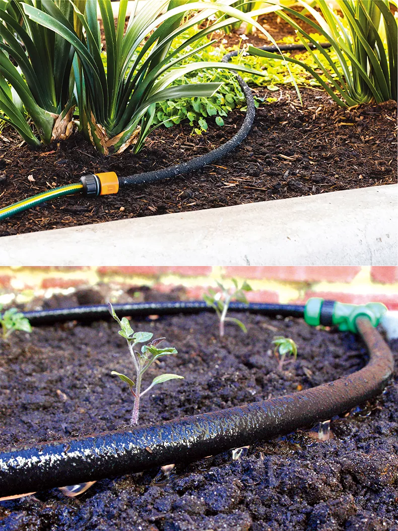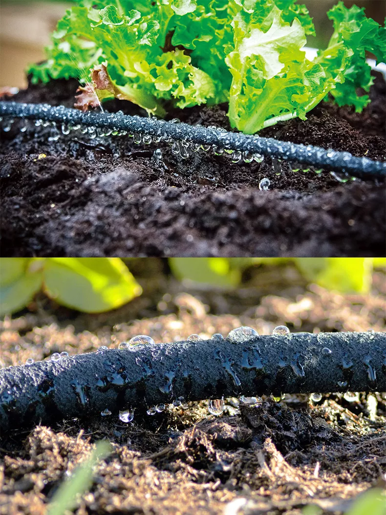 A szivárgó tömlő jellemzői: 1, Durva textúra mikropórusokkal – A tömlő fala tapintásra durvának tűnik, számos finom pórust tartalmaz az egyenletes vízkibocsátás érdekében. 2、Állítható áramlásszabályozás – A vízkibocsátás áramláskorlátozókkal (nyíláslemezekkel) szabályozható. 3. Teljes hosszúságú kibocsátás – A teljes tömlő egyenletesen engedi ki a vizet, lehetővé téve a közvetlen elhelyezést a növény gyökérzónái mentén a célzott öntözés érdekében.