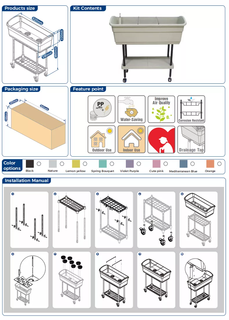 A Mobile Elevated Garden Bed megfelel az ergonómiai tervezési elveknek, különös tekintettel az idősekre, akiknek mozgási nehézségeik miatt nehezen tudnak guggolni. Egyrétegű tárolórekesz kialakításával mindenféle virág- és növénytermesztéshez szükséges szerszámot és kiegészítőt tárolhat. Univerzális kerekekkel van felszerelve, ami megkönnyíti a mozgását beltéri és kültéri környezetben egyaránt. Jól kielégítheti a városokban élők igényeit, akik szeretik az ültetést. Kiváló környezetet biztosít a növénytermesztéshez, és segít könnyen kialakítani saját ökológiai, zöld és egészséges életmódját.