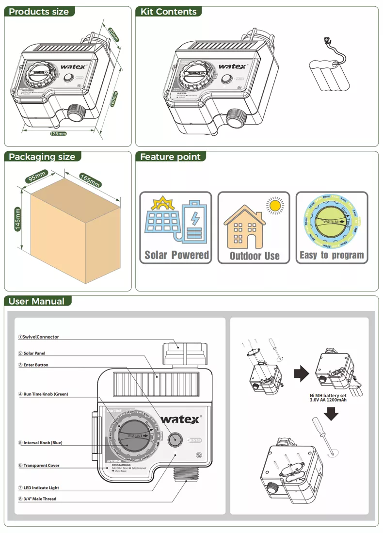A hasonló termékekhez képest a napelemes csapos időzítőnek nincs szükség az elemek gyakori cseréjére (normál használat mellett). Környezetbarát és energiatakarékos. Elegendő teljesítményű és tartós, így öntözőeszközzé teszi, amellyel nyugodt szívvel utazhat üzleti úton.