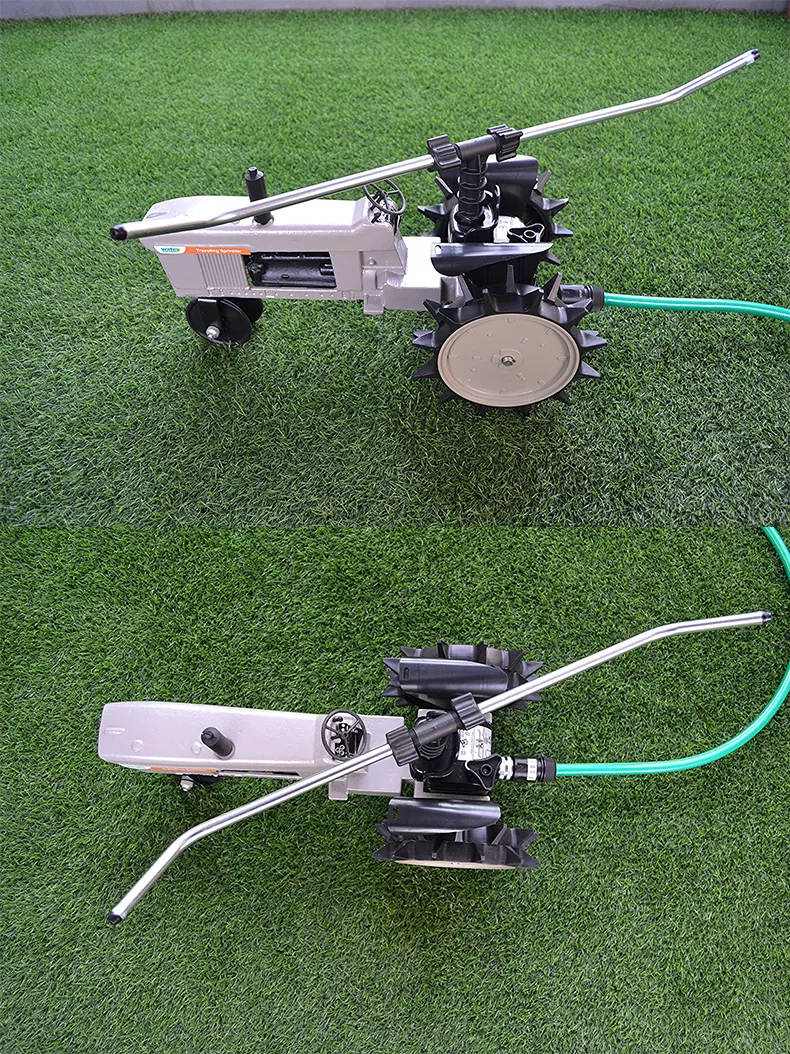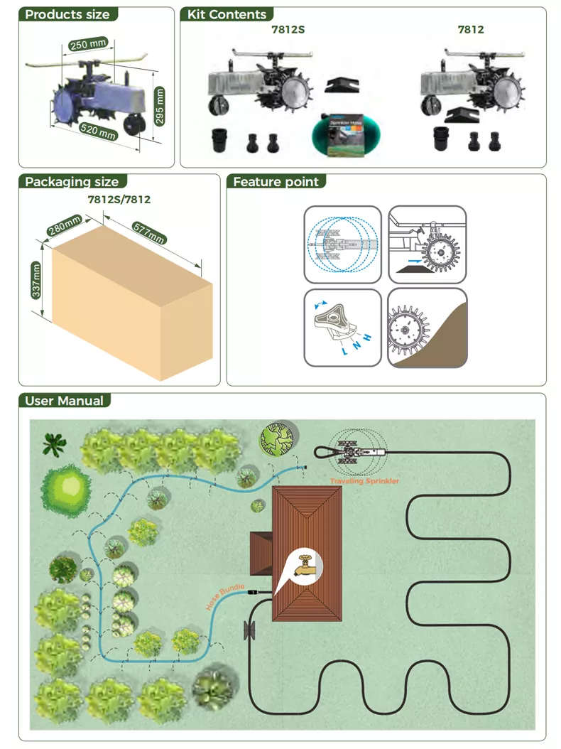 Üdvözöljük, hogy válassza ki a Watex által biztosított utazó öntözőt. Ez a termék egyedülálló traktor-stílusú, és egy önjáró vízi kocsi, amely víznyomással hajtja a mozgását, lehetővé téve a hatékony gyepöntözést.